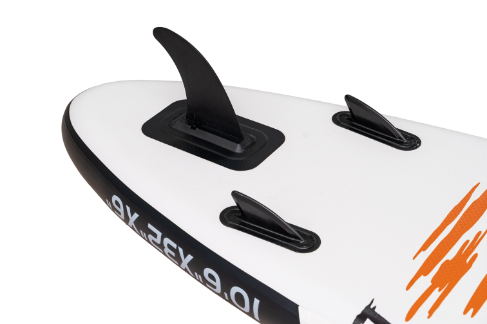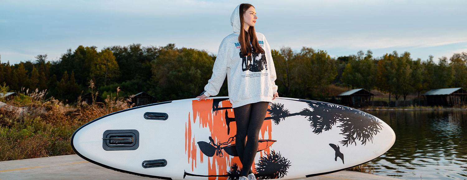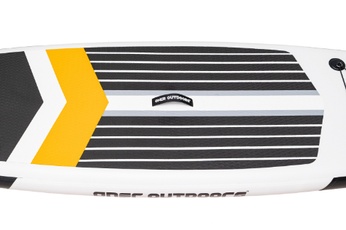 Эта универсальная доска выполнена в черно-оранжевой цветовой гамме из тканого матового материала. Доска легкая, но очень жесткая. Для эффективного устранения риска утечки воздуха в ней используются двухслойные боковые планки.